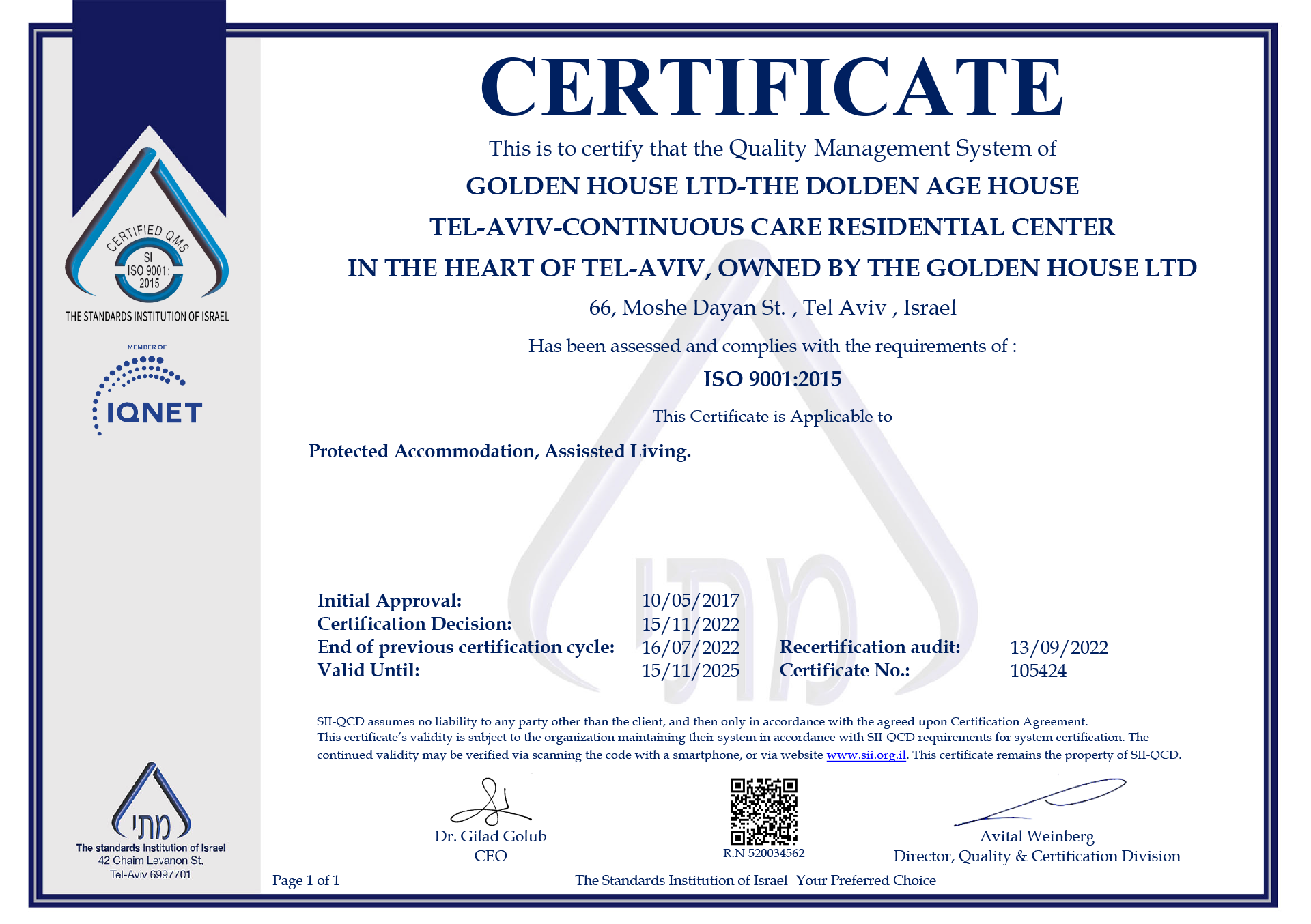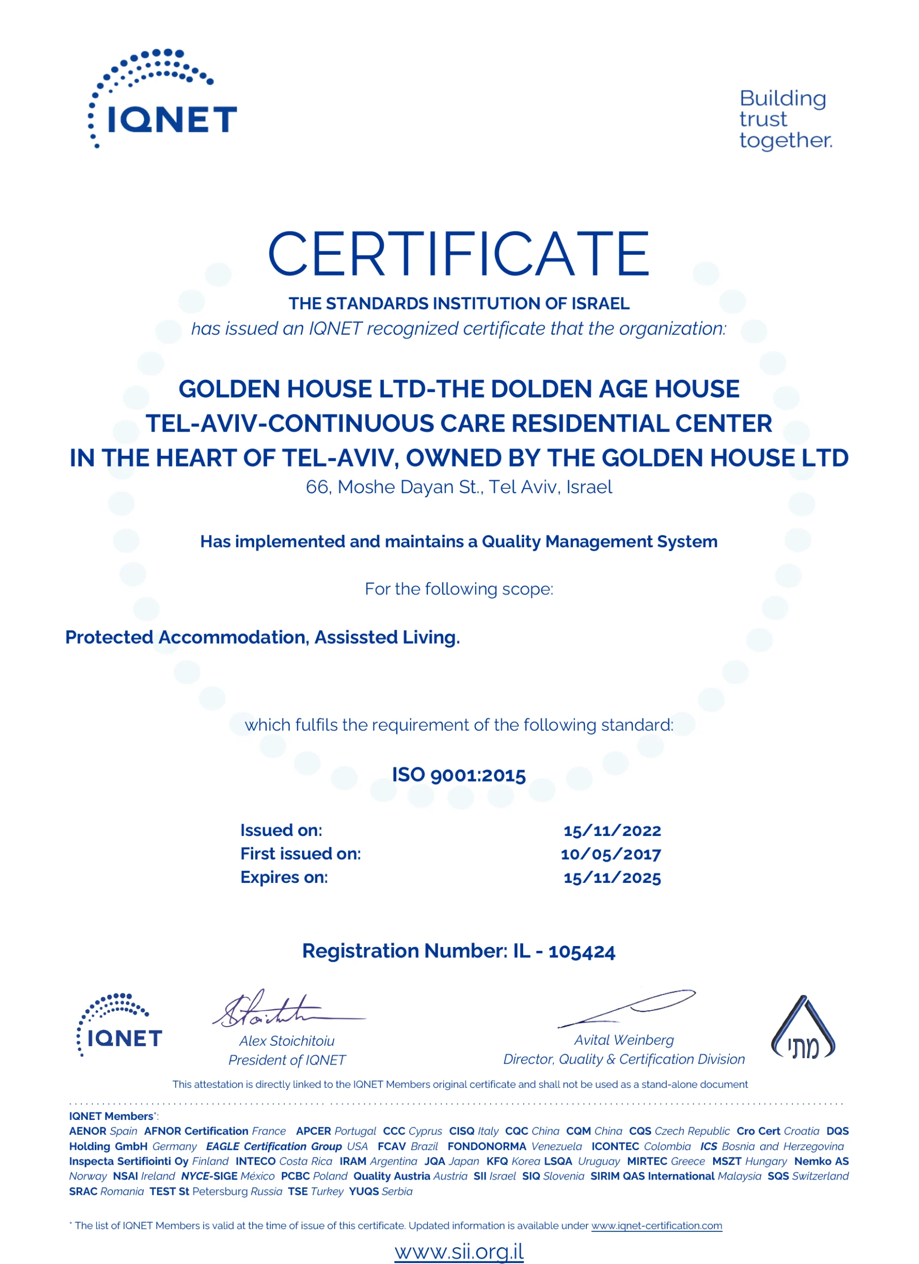 תעודת ISO זו אינה רק מסמך – היא עדות למחויבות העמוקה שלנו לאיכות השירות, לבטיחות הדיירים ולשיפור מתמיד של תהליכי העבודה והטיפול.